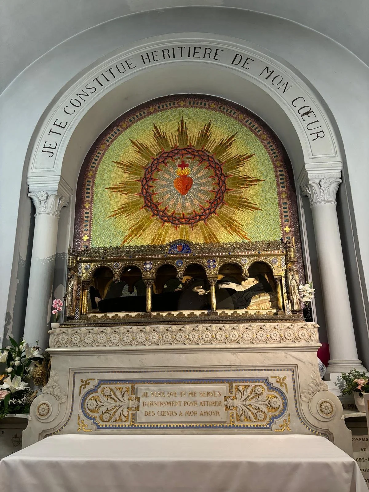 The tomb of Saint Margaret Mary in Paray-le-Monial, France. It was in this very chapel, at the Visitation Convent, that Christ appeared to her to reveal his Sacred Heart between 1673 and 1675. Above the tomb is the inscription: “I appoint you heir to my heart.”