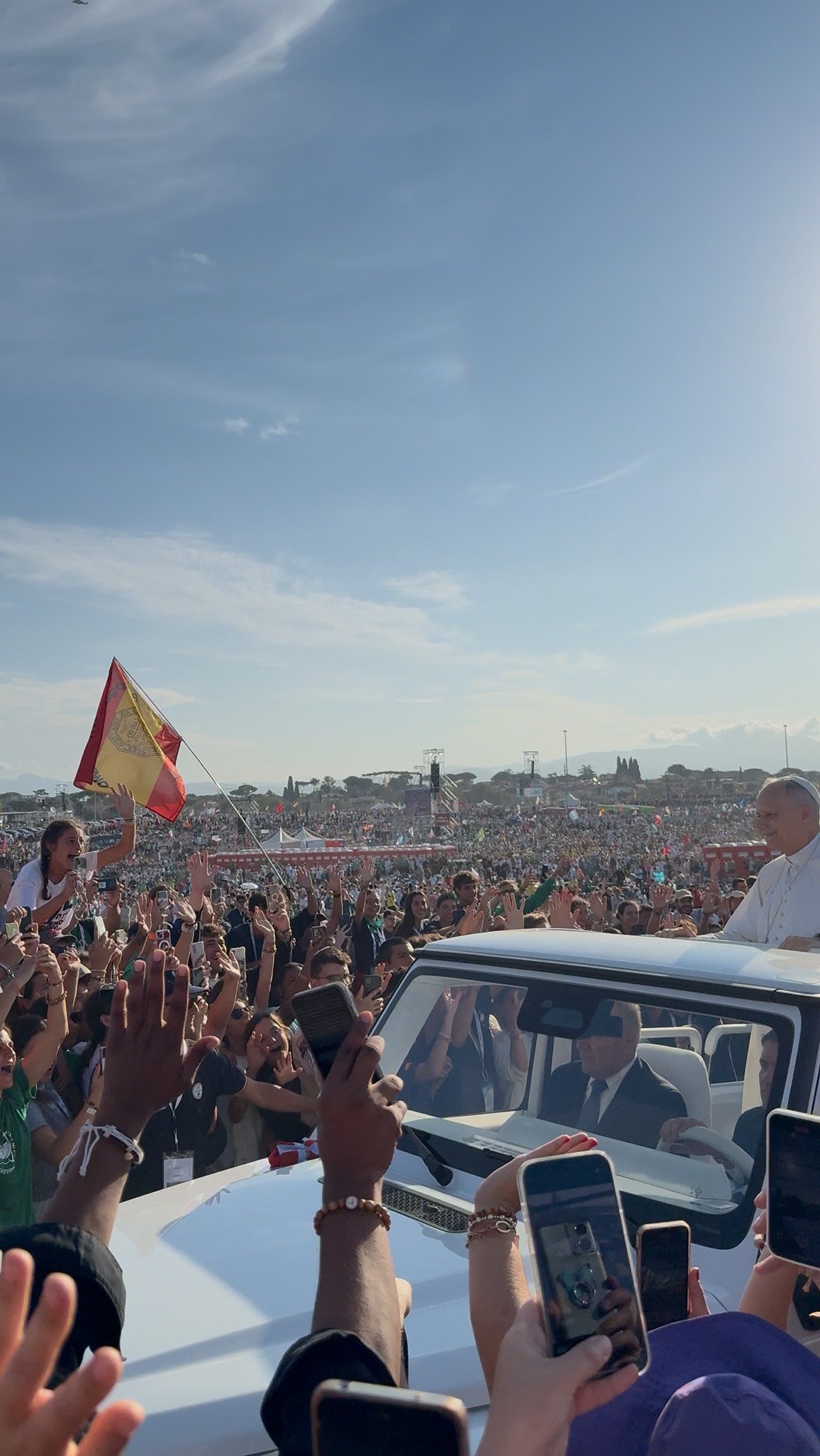 Catching a glimpse of Pope Leo as he drives towards the stage for Mass.